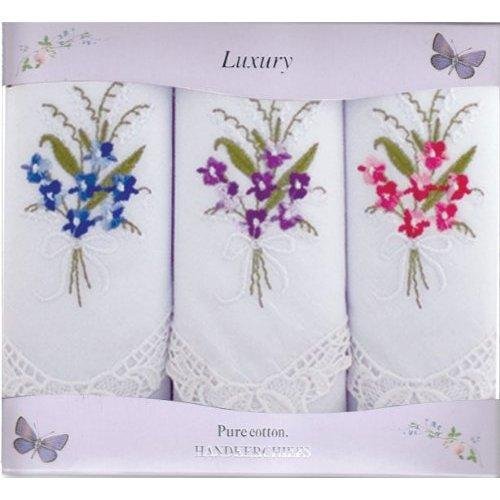 3 mouchoirs femme empaquetés bordure colorée avec coins en dentelle 100% coton